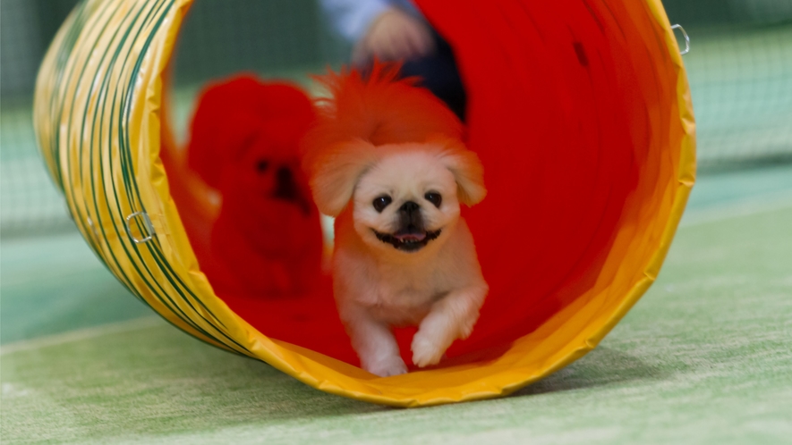 テニスコート1面分の屋内ドッグランは、雨が降っている日や紫外線が気になる季節でも安心して遊べるスペースです。ワンちゃんと一緒に障害物競走が楽しめるように簡易アジリティも設置されています。